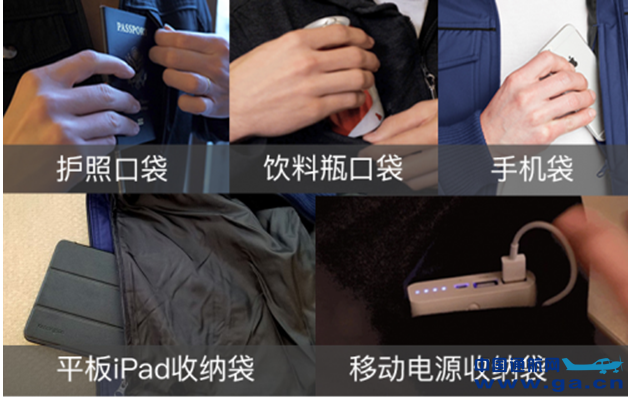 ![]() ![]() 4饮料瓶口袋,夹克里有可折叠的旅行用水瓶,方便旅途用水