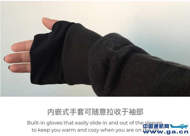 6内置手套:内嵌式手套可随意拉收于袖部,旅行时保护你的双手