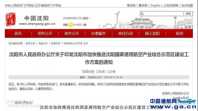 近日,沈阳市人民政府办公厅印发《沈阳市加快推进沈阳国家通用航空产业综合示范区建设工作方案》。