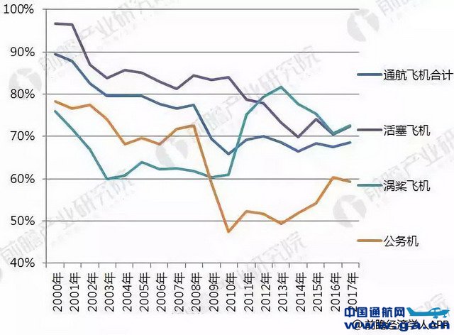 2000-2017年美国通用航空飞机交付量占全球比重情况(单位:%)