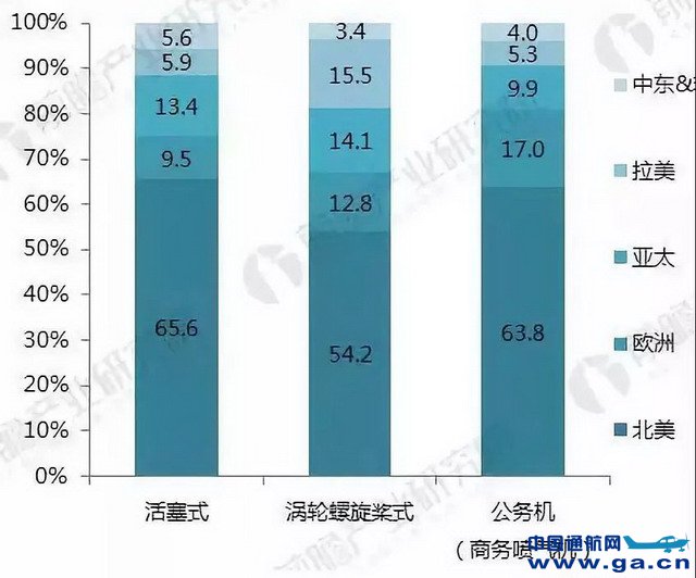 全球通用航空区域竞争情况:通航飞机交付量:北美占7成