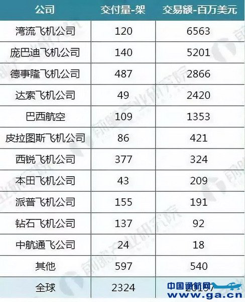 交易额排名前二的是湾流飞机公司、庞巴迪飞机公司,分别有65.63亿美元、52.01亿美元,合计占到58.2%。
