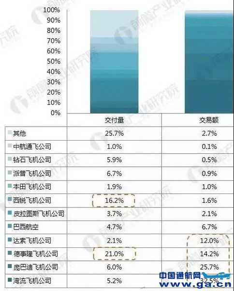 从通航飞机制造商来看,德事隆飞机公司是交付量最多的公司,2017年共交付487架,占全球比重达21%,交付量排名第二的是西锐飞机公司,占比达16.2%,但交易额仅占1.6%。
