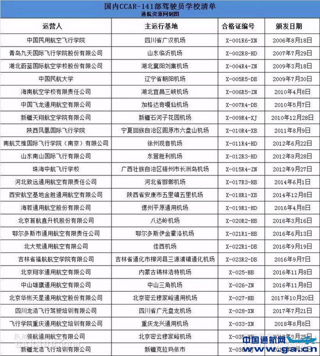 截至目前,我国141部航校总数已达25家。2018年9月10日,新疆龙浩飞行培训有限公司获颁CCAR-141部运行合格证。至此,本月已有2家企业获颁CCAR-141部运行合格证,2018年已有3家企业获颁CCAR-141部运行合格证。 据悉,领航通用航空有限公司成立于2013年,2015年3月获民航华北局颁发CCAR-91部《运行合格证》和《运行规范》,现运营7架钻石系列飞机。 141部航校,是指具有民航局CCAR-141部合格证(包括临时证)的飞行学校。这些飞行学校按照《民用航空器驾驶员学校合格审定规则》(CCAR141部)提供飞行训练,包括私照、商照、仪表等级课程和面向121部大型运输航空公司副驾驶培训的整体训练课程等。 截至目前,2018年新增3家141航校:飞行学院重庆通用航空培训有限公司、新疆龙浩飞行培训有限公司、领航通用航空有限公司、 2017年新增2家141部航校:四川龙浩飞行驾驶培训有限公司、北京华彬天星通用航空股份有限公司。 2016年新增7家141部航校:北京首航直升机股份有限公司、山东海若通用航空有限公司、鄂尔多斯市通用航空有限责任公司、北大荒通用航空有限公司、吉林省福航航空学院有限公司、北京翔宇通用航空有限公司、中山雄鹰通用航空有限公司。 |