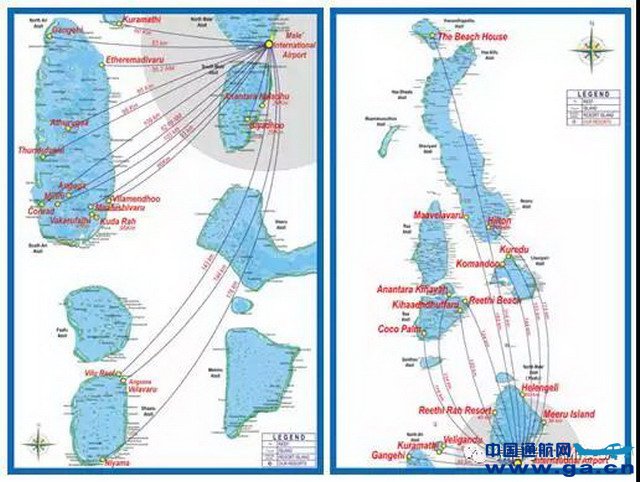 ![]() 图1 一架水上飞机正在前往Bathala 岛的北部 ![]() 图2 马尔代夫的航线分布 马尔代夫的水上飞机十分发达。由于国土主要由岛屿组成,大的环礁26个,约有1000多个大小不一的小珊瑚岛,岛屿平均面积仅1-2平方公里,岛际间的交通十分频繁,主要交通工具有航班、快艇及水上飞机。航班适合于远距离岛屿,如从马累到最南端的岛屿;而快艇适合于近距离的摆渡,一般40公里以内可选坐快艇。
