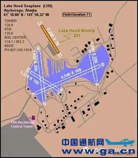阿拉斯加州最大的水上运营基地在安克雷奇(Anchorage)的霍德(Lake hood)。该水上运营基地是世界上最繁忙的水上机场,每天约有近200架次的起降,其中88%的为通用航空,12%的空中的士,也有少量的部队使用,有近800架飞机停泊在霍德湖水上运营基地,其中97%为单发,仅有少数为双发。