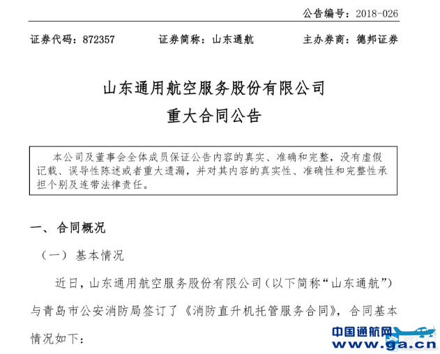 该合同服务内容为托管 2 家卡-32A11BC 直升机,服务期限为2018 年 9 月 25 日-2019 年 9 月 25 日。山东通航表示,合同的履行将给公司经营业绩、市场拓展、销售产生积极影响。