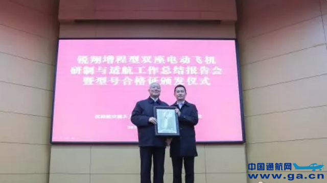 01锐翔增程型电动飞机获颁型号合格证 ![]() 中国民用航空局东北地区管理局副局长孔繁伟和中国工程院杨凤田院士出席并完成了颁证仪式。 王景巍 摄 10月19日,由辽宁通用航空研究院自主研发的中国首款加装整机降落伞的轻型运动类飞机——“锐翔增程型双座电动飞机RX1E-A”(以下简称“RX1E-A”),正式通过中国民用航空局(CAAC)各项审查,颁发型号合格证书(TC)。