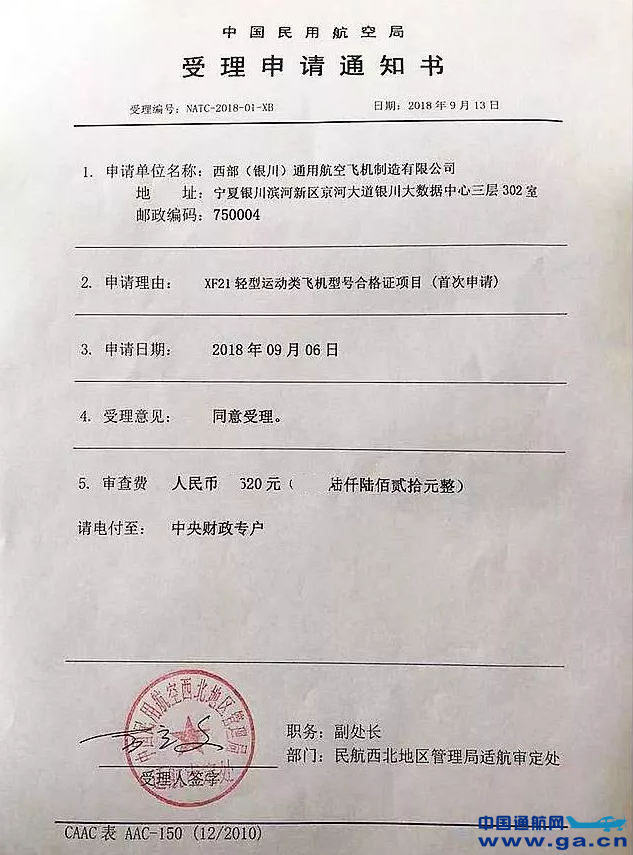 XF21飞机 2018年9月,民航局正式受理了XF21飞机的型号合格证(TC证)的申请,近日,西部(银川)通用航空飞机制造有限公司(简称“西部通航”)配合民航西北管理局召开了首次TC申请审查会议。这标志着西部通航XF21飞机的国产化进程有望提速,同时,此举是民航西北管理局受理轻型运动类飞机TC申请的首例,申请成功后将在西北地区开创先河。