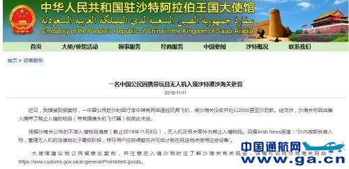 据中国驻沙特大使馆网站消息,近日,中国驻沙特大使馆接到报案称,一名中国公民赴沙时因行李中装有两架遥控玩具飞机,被沙海关没收并处以2000里亚尔罚款。经交涉,沙海关称因当事人携带了禁止入境的物品(带有摄像头的飞行器)故做此决定。