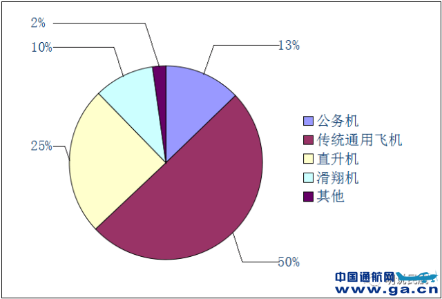 通用航空(General Aviation)是指使用民用航空器从事公共航空运输以外的民用航空活动,包括从事工业、农业、林业、渔业和建筑业的作业飞行以及医疗卫生、抢险救灾、气象探测、海洋监测、科学实验、教育训练、文化体育等方面的飞行活动。 我国现有的通用飞机种类繁多,性能差异巨大,运输业务并非使其主要功能。对于跑道长度的确定,无法采用运输机场跑道长度确定方法,即选定设计机型,结合航程、参考条件(温度、风力、跑道干湿状况)、飞机构型(襟翼构型、空调、防冰)、起飞重量、净空条件等进行计算和验证。对于新建通用机场,一般很难确定未来使用何种机型,因此,就需要一种可操作、快速有效的跑道长度确定方法。 依据《从统计看民航》、飞机制造商公布的飞机性能参数等公开数据,对我国在册通用飞机进行分类。鉴于官方公布的相关数据未明确划分传统通用航空作业飞机与公务(商务)飞机,本文对公务机与传统通用飞机区分原则是根据主要公务机制造商对某一机型的功能定位,个别通用飞机以私人飞机用途执行公务商务航空飞行未列入公务机统计中。如CESSNA-172机型,即可作为小型私人公务机,又可执行大多数通用航空飞行,但其制造商对本机型定位为小型通用飞机,因此将其按照传统通用飞机进行统计。 各类通用飞机数量占比 通用航空飞机类型较多,根据使用功能和机型特点等,将其分为通航作业飞机、公务机、滑翔机、直升机以及其他较特殊种类。
