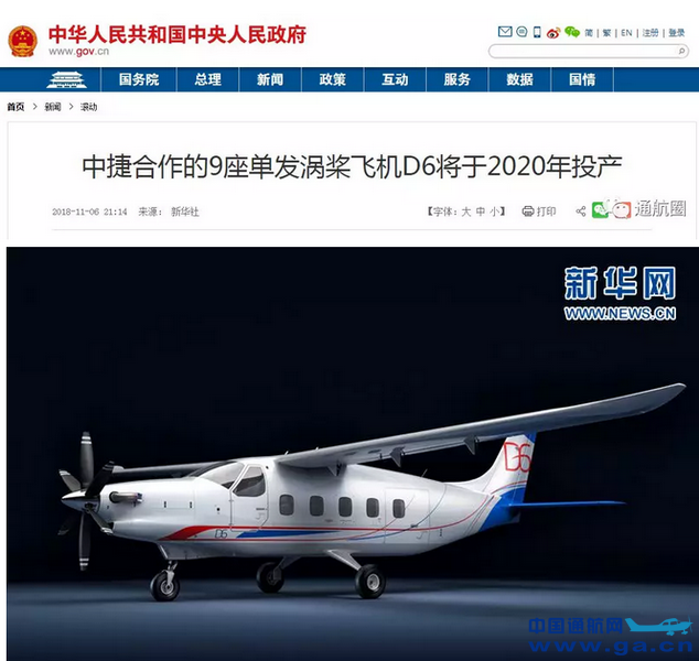 ![]() 此外,根据新华社最新报道,由中捷两国共同实施研发、设计、认证、生产和销售的9座单发涡桨飞机D6也将于2020年在自贡投产(见通航圈前文《单发涡桨自贡造!川捷合作D6飞机3D模型正式亮相珠海航展,预计首架机将于2020年在自贡下线》)。