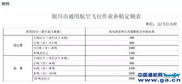 附件:银川市通用航空飞行作业补贴定额表