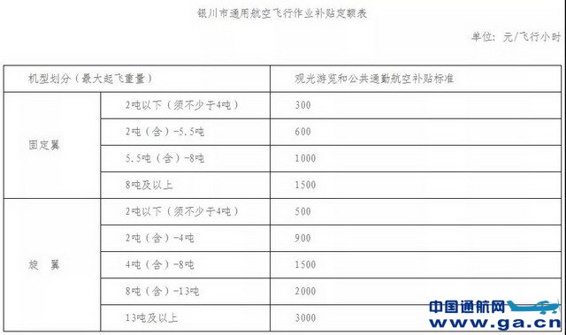 三、鼓励通用航空企业在银川市通用机场开展支线航空短途运输、观光旅游业务,对新开辟国内省会城市的定期客(货)运航线、国内其他城市定期客(货)运航线、不定期航班、经停航班,分不同最大起飞重量、不同种类机型,并结合飞行小时数给予通用航空飞行作业补助。以开飞之日起计算,给予三年飞行作业补助,补助标准按照《银川市通用航空飞行作业补贴定额表》执行,第一年补助100%、第二年补助90%、第三年补助80%。