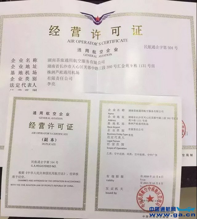 茶旅通航获颁发通用航空企业经营许可