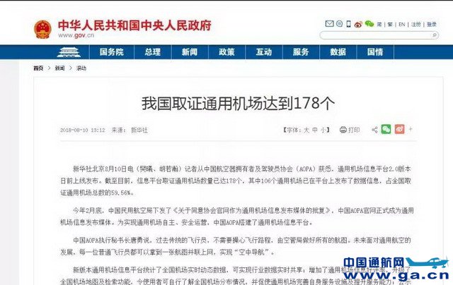 ![]() 中华人民共和国中央政府网对通用机场平台报道截图