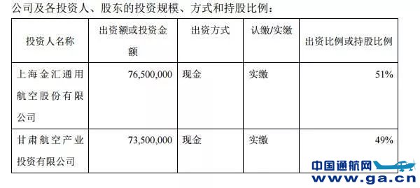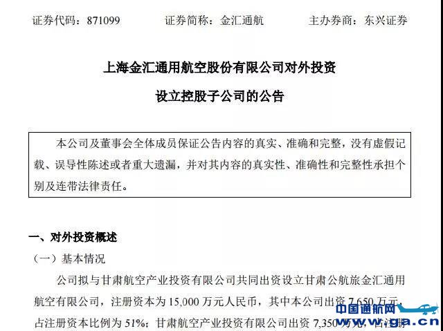 公告显示,金汇通航拟与甘肃航空产业投资有限公司共同出资设立甘肃公航旅金汇通用航空有限公司,注册资本为15000万元人民币,其中金汇通航出资7650万元,占注册资本比例为51%;甘肃航空产业投资有限公司出资7350万元,占注册资本比例为49%。
