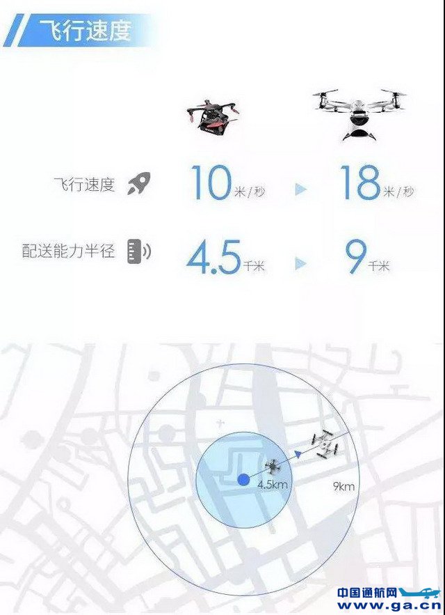 ![]() 3.飞行速度由10米/秒提升至18米/秒,配送能力半径由4.5千米提升至9千米,实现更快速度、更远距离的无人机配送服务。