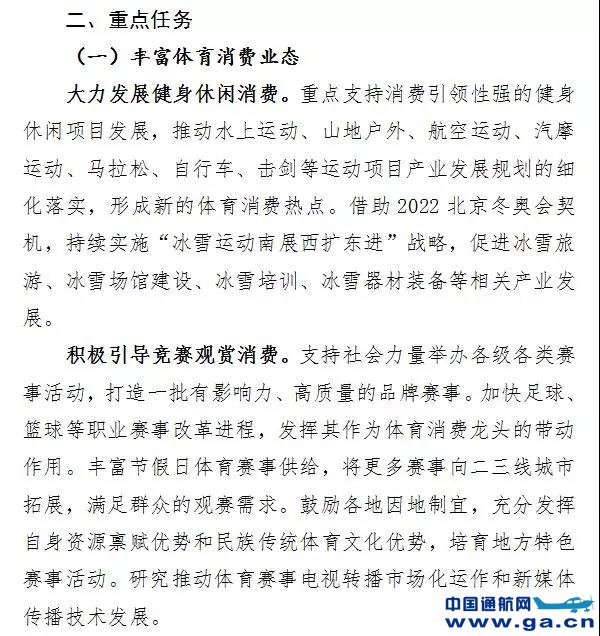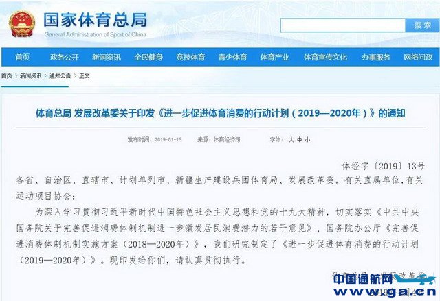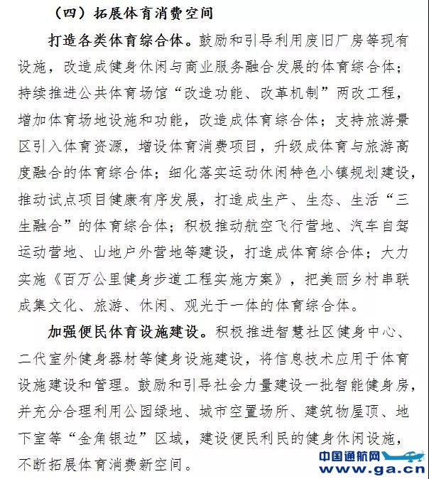 近日,体育总局及发改委印发《进一步促进体育消费的行动计划(2019-2020年)(以下简称“计划"),计划中明确表示:大力发展健身休闲消费,重点支持消费引领性强的健身休闲项目发展,推动水上运动、山地户外、航空运动、汽摩运动、马拉松、自行车、击剑等运动项目产业发展规划的细化落实,形成新的体育消费热点。;打造各类体育综合体,细化落实运动休闲特色小镇规划建设,积极推动航空飞行营地、汽车自驾运动营地、山地户外营地等建设,打造成体育综合体;健全体育消费政策体系,通过政府购买服务等途径,引导和支持体育企业提供更多适应群众体育消费需求的产品和服务。
