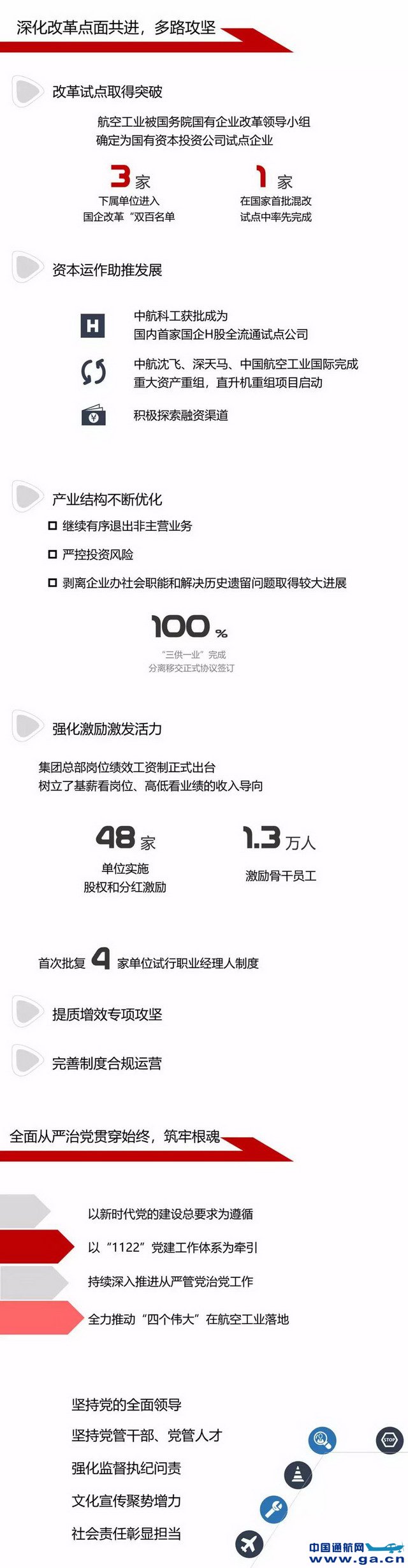 昨日(1月22日),航空工业2019年工作会在北京召开,航空工业党组书记、董事长谭瑞松作了题为《一心笃志改革攻坚开启全面建设新时代航空强国新征程》的工作报告。其中,比较那么报告具体内容是什么呢?航空工业官宣用“一图看懂”的方式进行了介绍。从图中可以看出,航空工业2018年除了继续深入推进军民融合战略外,在深化改革方面也取得了重大突破,尤其是航空工业在2018年12月被国务院国有企业改革领导小组确定为了国有资本投资公司试点企业,成为首家入围国有资本投资公司试点的军工央企集团(见通航圈前文《“战必用我”,资本市场热追国防军工板块,航空工业引领央企军工混改积极开展资本运作》),通飞公司、中航国际、机载公司3家单位进入国企改革“双百”名单,合肥江航在国家首批混改试点中率先完成; 资本运作助推发展,中航科工获批成为国内首家国企H股全流通试点公司,中航沈飞、深天马、中国航空工业国际完成重大资产重组,直升机重组项目启动(见通航圈前文《最终是要占领中国万亿级通航市场! 航空工业深化军民融合占领,宣布中航科工将全资收购中航直升机》),积极探索融资道路。 ![]() ![]() 谭瑞松还对航空工业集团党组的新时代集团发展战略即“一心、两融、三力、五化”进行了介绍:“一心”,坚定“航空报国”初心,笃行“航空强国”使命;“两融”,实行“军民融合”“产业融合”的新发展模式;“三力”,成为具有“领先创新力、先进文化力、卓越竞争力”的世界一流航空企业集团;“五化”,坚持“集约化经营、精准化管理、市场化改革、体系化发展、国际化共赢”的发展路径和原则。