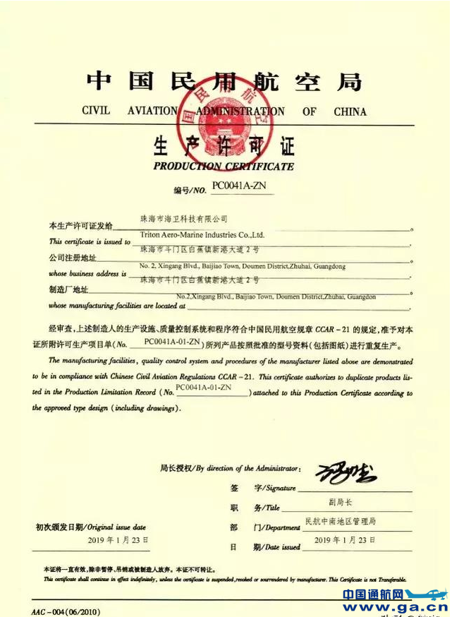 ![]() ![]() 海卫科技是珠海市第一家获得中国民航局颁发生产许可证的民营通用飞机制造商。在飞机制造行业,生产许可证是民航局通过对申请人的组织机构、生产工艺和设施、质量控制等资料进行审查,认为申请人具备符合法规的质量控制系统,批准申请人对该机型进行重复生产的资质证书。取证目的是在局方的生产监管下,按照经局方批准的型号设计进行重复、高质量、稳定可靠的生产,是项目从研制成功到批量生产的重要环节,以及实现商业成功的必经之路。