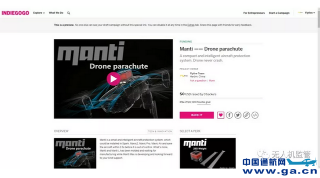 本文链接地址:告别炸机,Manti-无人机安全伞众筹上线引关注