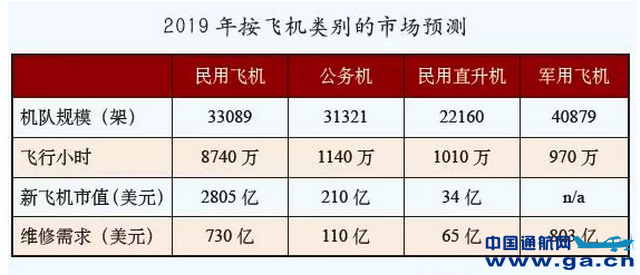 尽管2019年一些经济不确定因素使大家保持谨慎,但2019年航空业仍会迎来一片生机。以MRO市场为例,2019年民用、军用、直升机和公务市场的维修总市值将达到1708亿美元。