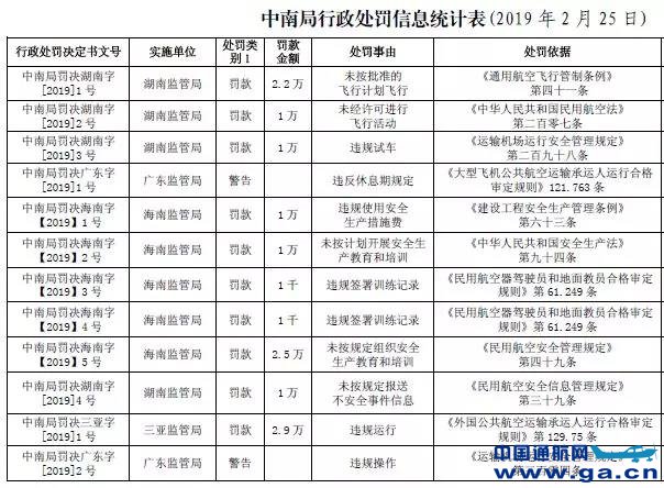 2月26日,民航中南地区管理局发布《中南局行政处罚信息统计表》(2019年2月25日),包括了2019年1月1日-2019年2月25日期间中南局的民用航空行政处罚信息。其中,通用航空处罚涉及4起。详情如下: