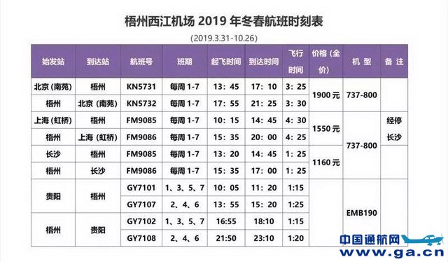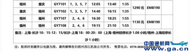 据了解,梧州至贵阳航线每逢周一、三、五及周日通航的航班号为GY7102,将在当天16时55分从梧州西江机场起飞,于18时10分到达贵阳,飞行时间为1小时15分钟。梧州至贵阳航线每逢周二、四、六通航的航班号为GY7108,将在当天21时50分从梧州西江机场起飞,于23时10分到达贵阳,飞行时间为1小时20分钟。