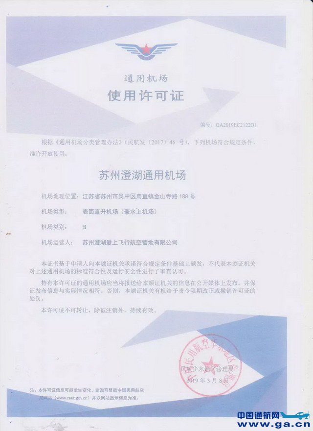 前几日通航在线发布了一篇关于飞行营地的实地考察内容(飞行营地规划如何与市场接轨?澄湖飞行营地模式探索颇有启发,戳此了解详情),文中指出澄湖航空飞行营地正在向民航华东局及江苏监督局申请水上机场的认证,一旦获批,将成为华东第一个取证的水上机场。目前,澄湖航空飞行营地(苏州澄湖通用机场)已获得通用B类许可,同时,也是华东地区首家获批的水上机场。 据了解,3月1日,澄湖航空飞行营地向中国民航江苏安全监督管理局递交了通用机场B类使用许可证的申请。一周后,民航江苏安监局就发文,颁发了苏州澄湖通用机场B类许可的批复。