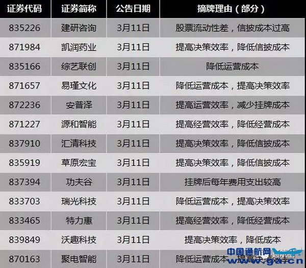 据证券时报统计,3月11日公告拟申请终止挂牌的20家新三板公司中,明确提到“降低运营成本”或“降低信披成本”的公司多达13家,占比65%;而在上周3月8日,公告拟申请终止挂牌的新三板公司有22家,其中也是有10家给出了“降低运营成本”等理由。