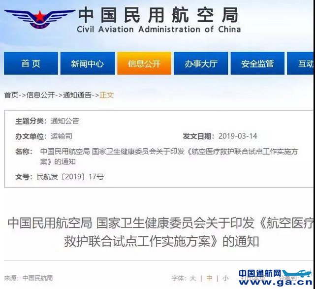 为充分发挥通用航空在医疗救护领域的作用,提升航空医疗救护体系和能力建设,3月19日,中国民用航空局、国家卫生健康委员会联合印发《航空医疗救护联合试点工作实施方案》(以下简称《方案》),决定从即日起至2020年12月31日在12个省(市)开展航空医疗救护联合试点工作。 ![]() 《方案》以“全面贯彻落实党的十九大、十九届二中、三中全会精神,以习近平新时代中国特色社会主义思想为指导,统筹推进‘五位一体’总体布局,协调推进‘四个全面’战略布局,推进我国航空医疗救护体系建设,满足人民群众对优质医疗服务的迫切需要,促进我国通用航空业与医疗救护事业的融合发展”为指导思想,以“安全第一、提升服务,政府引导、合作创新,试点探索、形成规范”为基本原则。预期在试点结束时,试点医疗机构能够建立起完善、高效的与通用航空运营单位间信息沟通、协同联动机制,为探索建立符合中国国情的医疗机构开展航空医疗救护业务相关标准及规范体系奠定基础。