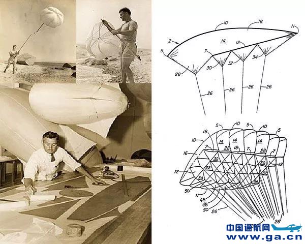 ![]() 时光流转到1964年,来自美国佛罗里达州的多米那-戛尔伯特发明了冲压空气蓬,这种双面的顶蓬有一个开放的前缘和一个缝合的后缘,当空气冲压进帆内并填满,就会产生一个翼型。 |