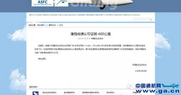 ![]() 经审核,兹确认中国航空运动协会会员商广伟(会员证号码:F-649),于2018年12月18日在澳大利亚纳若曼,完成滑翔机600公里闭合航线纪录飞行,并且获得澳大利亚滑翔协会颁发的600公里成绩证书。澳大利亚滑翔协会是国际航联授权的滑翔机飞行纪录申请组织,因此中国航协对商广伟取得的成绩予以认可。