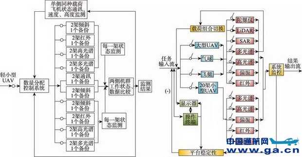 基于无人机载荷、平台组合冗余的容错体系是未来智能控制环境下对地观测的必要系统模块。以飞艇、气球、大型无人机、多架轻小型无人机等多平台为依托,搭载多光谱、高光谱、偏振、红外以及激光雷达等多载荷,实现无人机群组网冗余智能观测,满足平台可替代,载荷可替代,组合工作流可替代,即满足冗余重构,达到提高整体观测保险系数的目的,避免在某一平台出现故障时系统崩溃或失效。图14是无人机群组的智能控制冗余容错对地观测系统的示例。 中国通航网 www.ga.cn 通航翻译 www.aviation.cn 本文链接地址:中国无人机遥感技术突破与产业发展综述(23) |