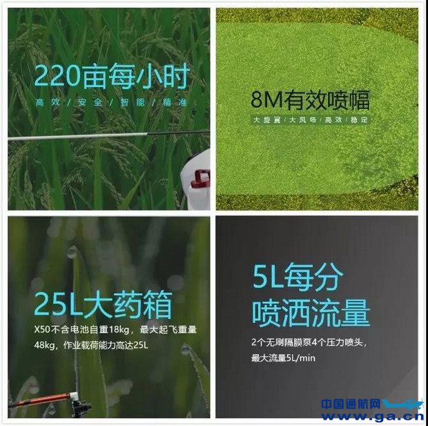 这款无人机载荷系数高达0.5,最大起飞重量为50kg,可携带25L药量,最大好处就是一次起飞5分钟就可作业30亩,在效率上有显著优势,每小时有效作业面积可达220亩。