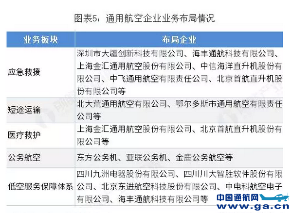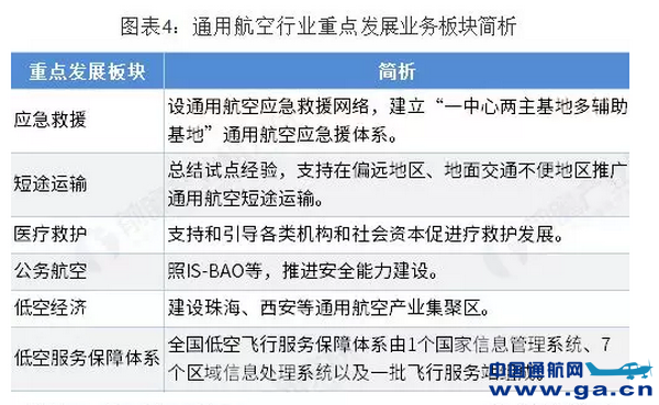 根据国务院发布的《关于促进通用航空业发展的指导意见》,发改委发布的《通用航空“十三五”发展规划》及近期发布的相关通用航空政策文件,通用航空产业短期重点发展业务板块包括:应急救援、短途运输、医疗救护、公务航空、低空经济以及低空服务保障体系建设。