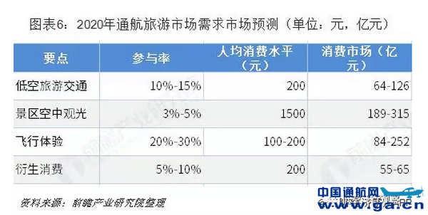 据不完全统计,2018年围绕上述景点开辟的低空旅游线路已有90余条。预计2020年全国5A级旅游景区游客数量达到8.4亿人次,其中适宜低空旅游的自然型景区游客约占50%以上,即保守估计2020年低空旅游潜在游客将达到4.2亿。低空旅游的市场需求包括旅游交通、景区空中观光、飞行体验及衍生消费四个部分。综合四类旅游消费总额,取最大值和最小值的中位数,预计到2020年,将有望形成585亿元的市场消费规模。