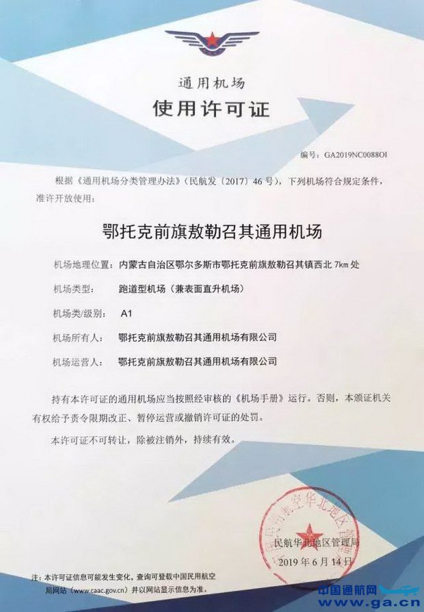 6月14日,鄂托克前旗通用机场正式获得中国民用航空华北地区管理局颁发的A1类通用机场使用许可证,标志着鄂托克前旗通用机场已符合民航局规章标准,满足运营要求,可正式投入使用。