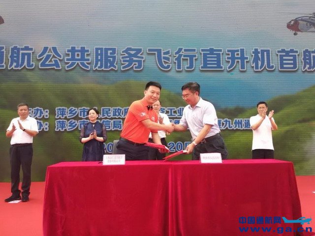 6月20日上午,由萍乡市人民政府主办,萍乡市工信局、市文广新旅局、市应急管理局、武功山管委会承办,以“追梦武功”为主题的萍乡市通航公共服务飞行直升机首航仪式,在武功山景区游客中心广场隆重举行。金汇通航江西分公司等通航公司应邀出席此次活动,并与萍乡市政府签署《通航服务协议》。 ![]() ![]() 萍乡市工信局局长汤萍方与金汇通航江西分公司总经理吴商正签约