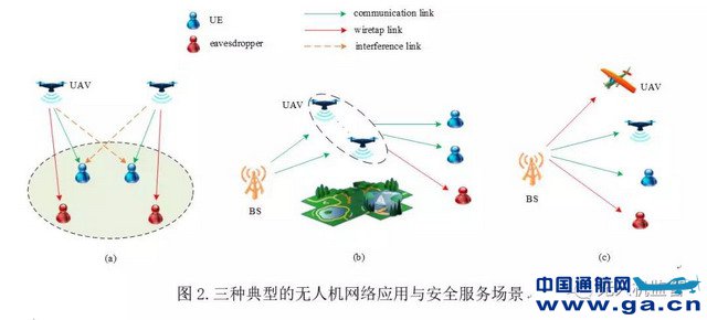 ![]() 无人机搭载的无线通信网络是一个动态的分层网络,其传输的数据易受未授权用户的窃听,因此安全传输是一个重要课题。该研究团队引入了三种典型的无人机网络窃听场景如图2所示。(1)在无人机辅助基站覆盖场景中,通过部署无人机平台充当移动的空中基站,并辅以现有的网络架构进行无线信息传输,可以实现无线网络覆盖区域的快速移动;(2)无人机可作为空中移动中继为远距离用户或用户群之间提供无线连接;(3)无人机可作为空中用户与地面用户共存,支持物联网的应用,特别是航空货运服务(如亚马逊Prime Air和谷歌Wing项目)。
