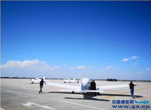 ![]() 四川泛美复装人员将复装检测完毕后的PA-28飞机推至停机坪。