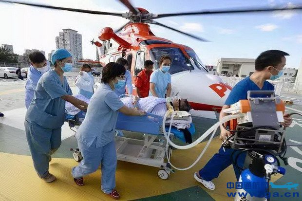 16:22,救援直升机平稳降落在北京中日友好医院的停机坪,病患由医护人员通过医院绿色急救通道送入ICU病房。
