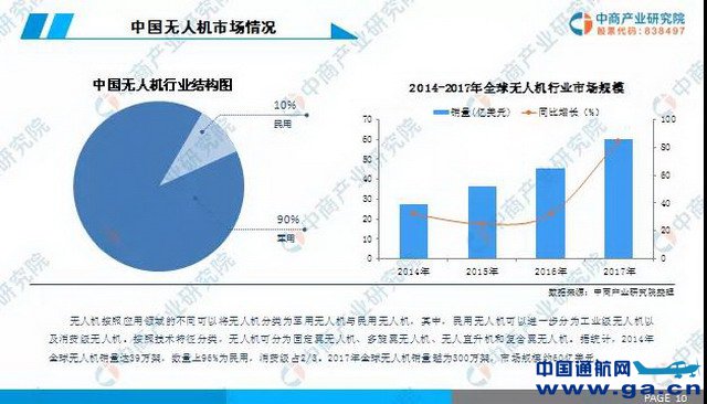 无人机按照应用领域的不同可以将无人机分类为军用无人机与民用无人机,其中,民用无人机可以进一步分为工业级无人机以及消费级无人机。按照技术特征分类,无人机可分为固定翼无人机、多旋翼无人机、无人直升机和复合翼无人机。据统计,2014年全球无人机销量达39万架,数量上96%为民用,消费级占2/3。2017年全球无人机销量约为300万架,市场规模约60亿美元。