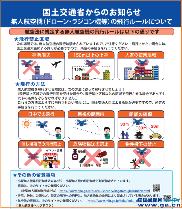![]() 日本《航空法》规定,操纵重200克以上的无人机在市区及活动现场上空、机场周边飞行,或在操纵者目视范围外飞行等,实施此类高危险性飞行时,必须事先获得政府许可。