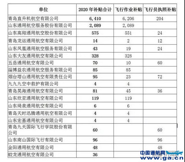 值得关注的是,青岛九天国际飞行学院股份有限公司、山东南山国际飞行有限公司等4家航空公司没有飞行作业补贴,另外,东通用航空服务股份有限公司、山东大友通用航空有限公司等8家航空公司没有飞行员执照补贴。