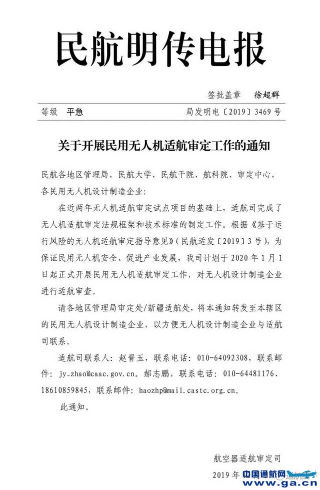 元旦前夕,民航局适航司发布通知,于2020年1月1日正式开展民用无人机适航审定工作,对无人机设计制造企业进行适航审查。 ![]() 为保证民用无人机安全、促进产业发展,根据“基于运行风险的无人机适航审定”原则(见前文《解读+全文 | 快速响应号召!民航局适航司印发《基于运行风险的无人机适航审定指导意见》,突出“中国特色”!》),在前期无人机适航试点基础上,民航适航审定司于2019年12月31日正式发文,通知国内各无人机设计制造单位,从2020年1月1日起可正式向航空器适航审定司提出民用无人机适航审定申请。