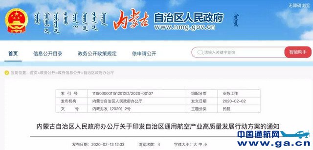 为全面贯彻落实《交通强国建设纲要》《新时代民航强国行动纲要》精神,完善内蒙古自治区通用机场规划布局,优化通用航空运输网络,促进通用航空产业发展。2月13日,内蒙古自治区人民政府办公厅印发自治区通用航空产业高质量发展行动方案的通知,以下为通知原文: