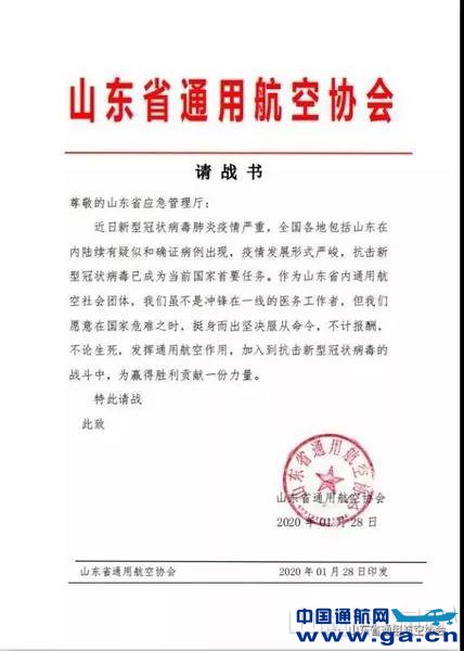 山东省通用航空协会向山东应急管理厅、济南市应急管理局、民航山东监管局等部门主动请缨并呈交《抗击新型冠状病毒疫情防控请战书》,志愿加入疫情防控工作队伍,为人民群众生命健康保驾护航。