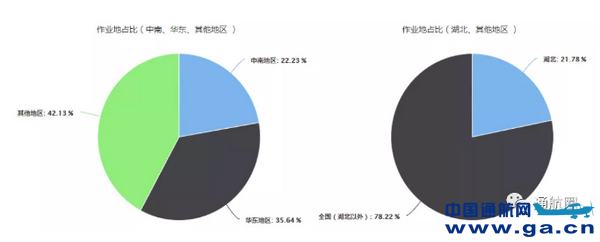 ![]() 3.作业力量相对集中。在执行任务企业、作业飞行时间方面,30.7%的通航企业、20.7%的作业飞行时间发生在湖北 地区,相对集中。